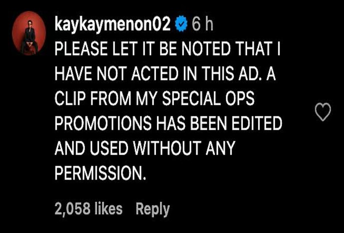 केके मेनन ने अपने वीडियो के नीचे कमेंट करते हुए लिखा, ‘कृपया ध्यान दें कि मैंने इस विज्ञापन में अभिनय नहीं किया है। यह मेरे स्पेशल ऑप्स के प्रमोशन का एक क्लिप है, जिसे बिना अनुमति के एडिट करके इस्तेमाल किया गया है।’ आपको बता दें कि वीडियो में केके मेनन कहते हैं, ‘रुको, रुको दोस्त। स्क्रॉल करना बंद करो। अगर आप इसे अभी देख रहे हैं, तो इसका क्या मतलब है…’