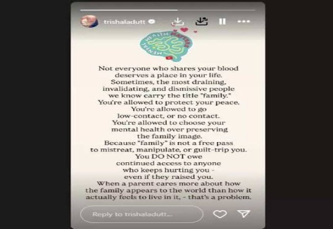 Let us tell you that Trisha Dutt wrote at the beginning of her cryptic note that just because someone is your blood relative, it does not mean that they should get a place in your life. 37-year-old Trishala wrote, ‘Not every person who is related to you by blood deserves a place in your life. Sometimes, the most tiring, invalidating, and neglectful people we know are called ‘family’. You have every right and permission to save your peace.’