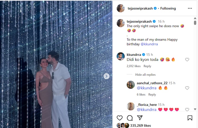 While the message seemed heartfelt, the line “Now he only swipes right” caught the attention of fans and followers. Many people interpreted it as a direct reference to Karan’s past relationship, particularly to his previous use of dating apps, which has been the subject of some controversy. Fans quickly flooded the comments, praising Tejasswi’s bold words and some even dropping cheeky remarks like, “What a perfect wet kiss,” in reference to the romantic photos shared.