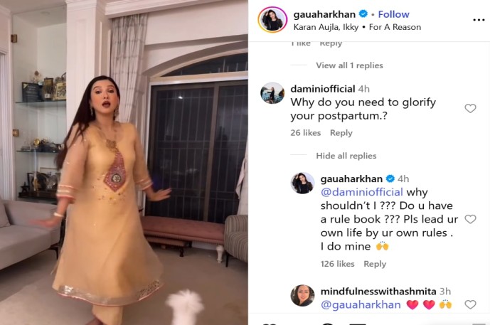 One Instagram user questioned why Gauahar was glorifying the postpartum period, implying that her performance was unrealistic or inappropriate so soon after giving birth. Gauahar didn’t hold back in her response and said, “Why shouldn’t I??? Do you have a rule book??? Please live your life by your own rules. I live by my own rules.” Her confident reply struck a chord with many followers, who immediately came to her defense.