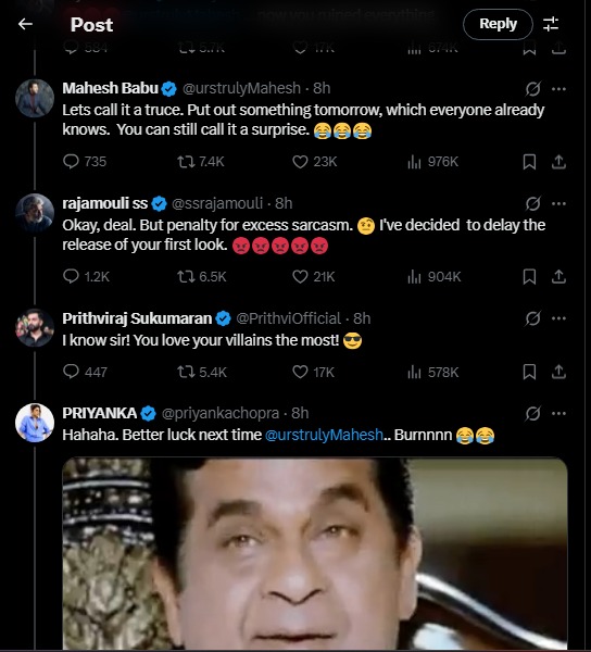 Rajamouli responded that it had already begun and that he would be revealing things one by one. Not one to back down, Mahesh Babu joked again, “How slow, sir? Will we start in 2030? For your information, our Desi Girl has been posting about every street in Hyderabad since January.” With that, he tagged Priyanka Chopra, and fans instantly caught the hint! Soon after, Priyanka Chopra and Prithviraj Sukumaran jumped into the conversation, playfully confirming their involvement. Rajamouli, realizing the surprise had been spoiled, jokingly expressed mock anger at Mahesh Babu.