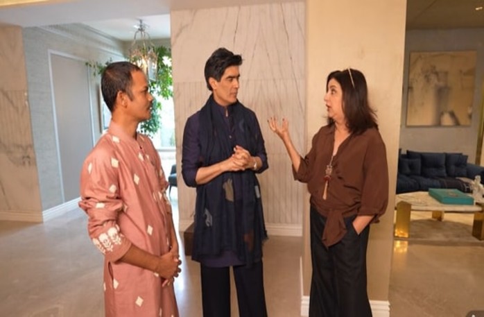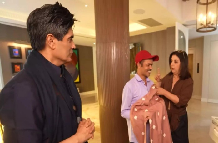 In the latest vlog, Farah and Dilip visited the home of renowned fashion designer Manish Malhotra, and the moment the two met became an instant delight for viewers. As soon as Dilip entered Manish Malhotra’s residence, the designer warmly held his hand and said, “I have a gift for you.” His assistant handed him a bag, and Manish presented it straight to Dilip, adding, “This is for you.” Farah, amused as always, jokingly asked Dilip to give her whatever was inside the gift bag. Manish quipped back that his clothes wouldn’t fit her anyway, leaving everyone laughing.