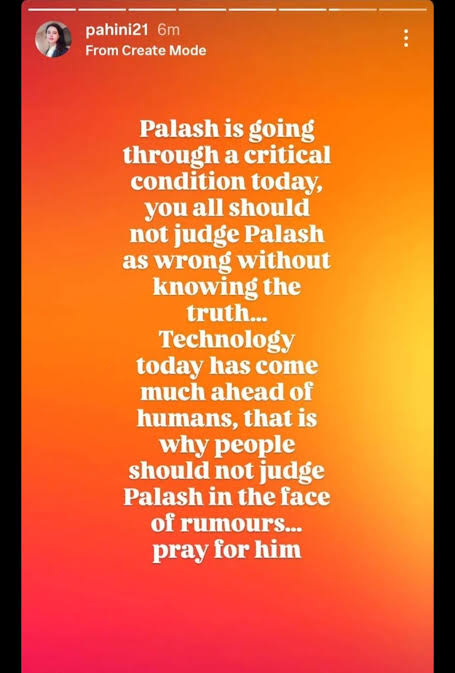 Her message appears to address the growing chatter on social media after screenshots of an alleged chat began circulating online. According to viral posts, Palash is allegedly seen telling choreographer Mary D’Costa that his relationship with Smriti was long-distance and almost over. However, Palash has not confirmed or denied the authenticity of the alleged chat, neither his family has made any official statement, and even no verified source has confirmed the chat’s legitimacy.