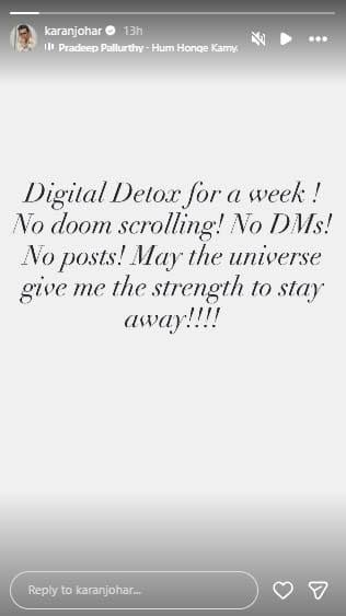 Bollywood filmmaker Karan Johar, who is known for his active presence on social media, has announced a short break from the digital world. The celebrated director and producer has decided to go on a week-long digital detox, temporarily stepping away from Instagram and online interactions. Karan Johar shared the update through his Instagram status, revealing his intention to disconnect from mindless scrolling, messages, and posts.